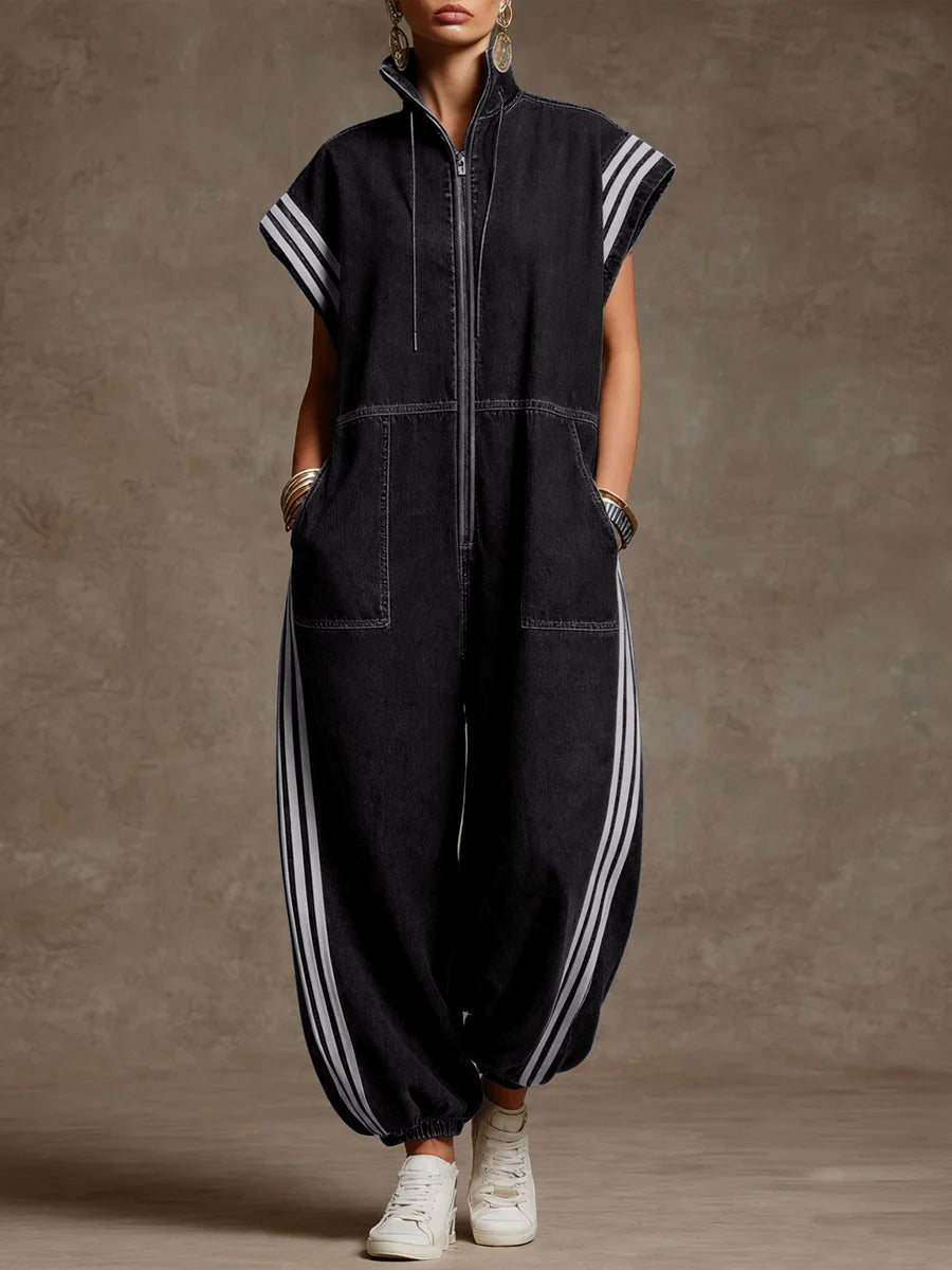 Sleeveless Wide Leg Contrast Color Printed Shoulder Pad Striped Jumpsuits