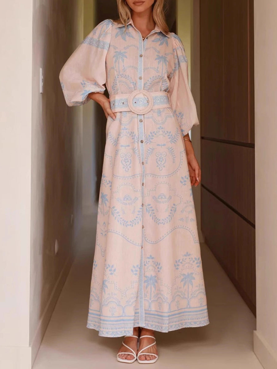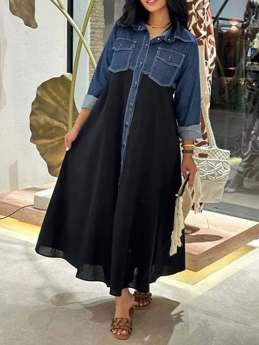 A-Line High Waisted Buttoned Contrast Color Printed Split-Joint Tied Waist Lapel Maxi Dresses Shirt Dress