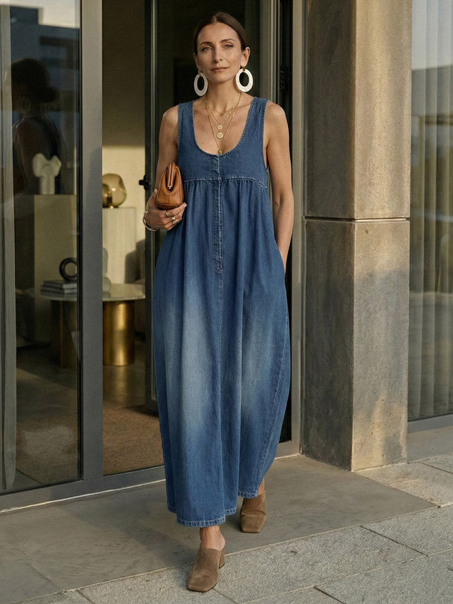 A-Line Loose Pleated Solid Color Split-Joint Tiered Round-Neck Evening Dresses Maxi Dresses