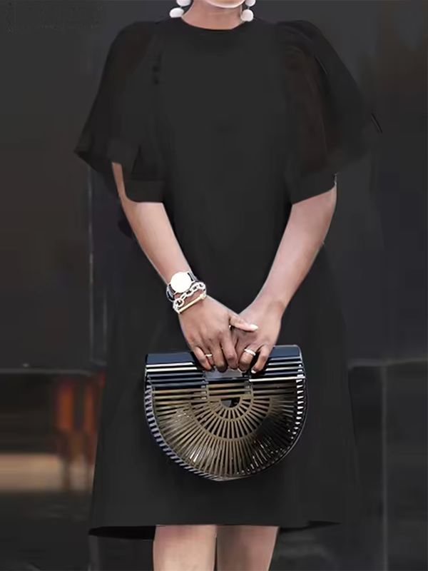 Flared Sleeves Half Sleeves Solid Color Round-Neck Mini Dresses