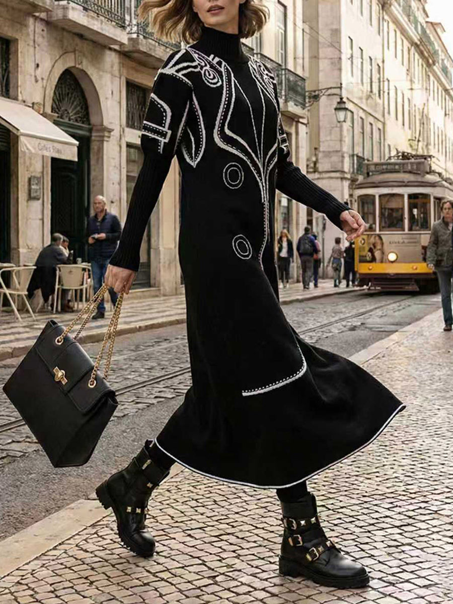 Balloon Sleeves Long Sleeves Big Hemline Contrast Color Pleated Print Zipper Stand Collar Maxi Dresses