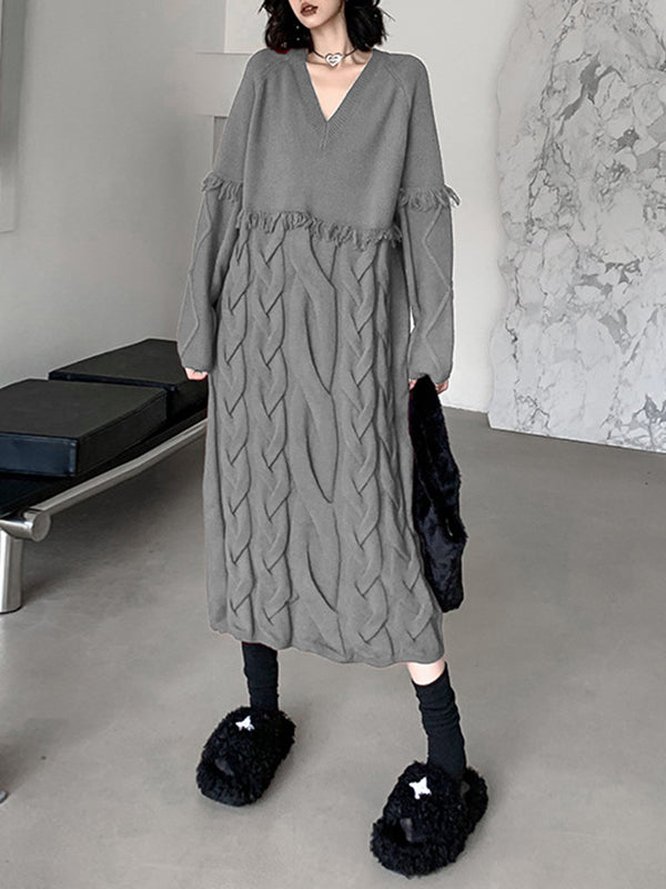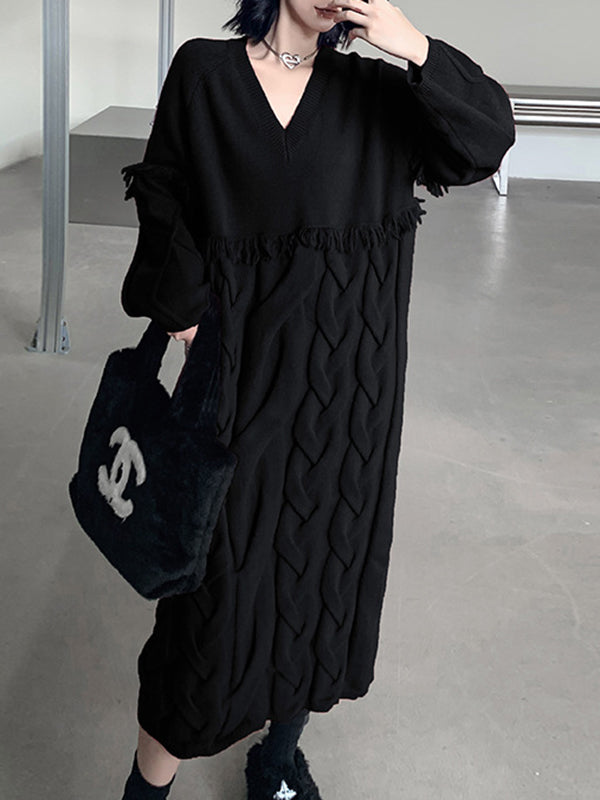 Irregularity Long Sleeves Contrast Color Sequined Shiny Split-Joint Tasseled V-Neck Midi Dresses Sweater Dresses