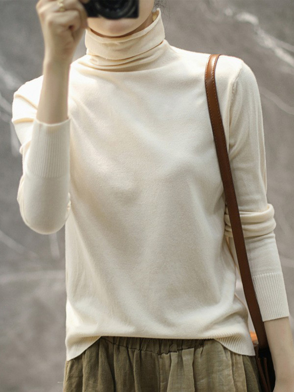 Casual Loose Long Sleeves Solid Color High-Neck Sweater Tops