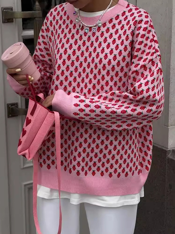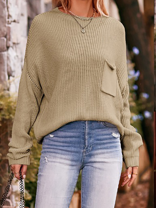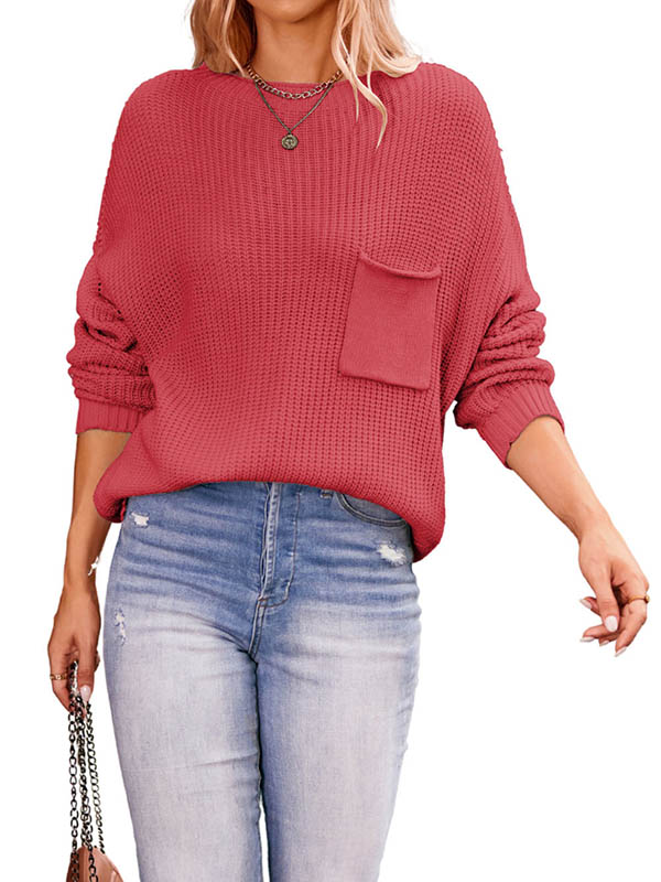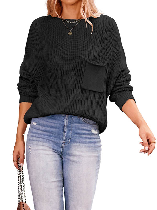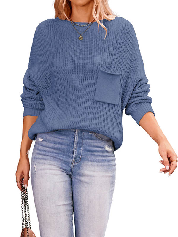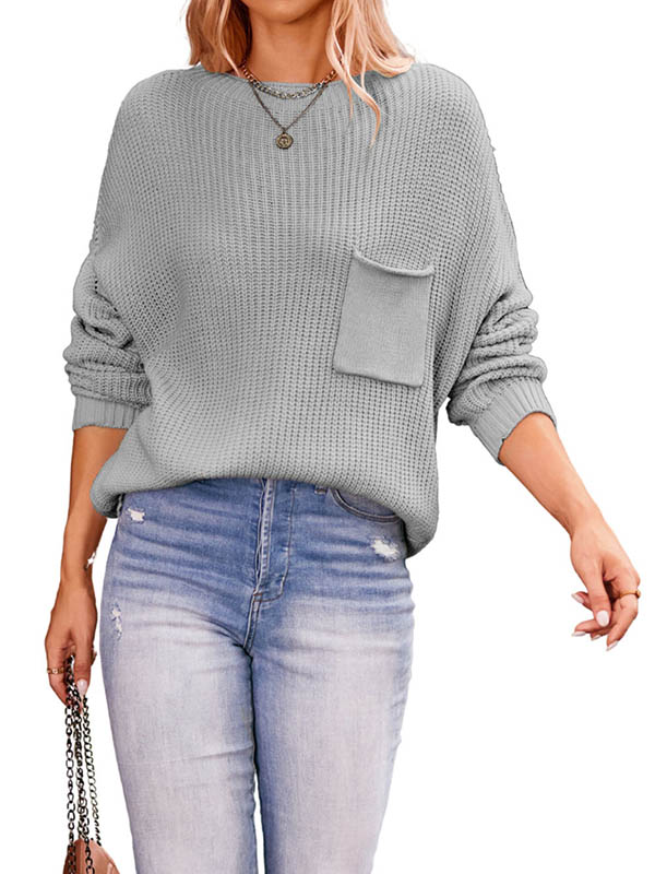 Split-Joint Solid Color Pockets Loose Long Sleeves Round-Neck Sweater Tops Pullovers