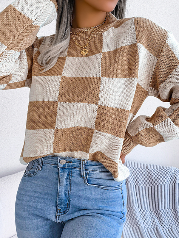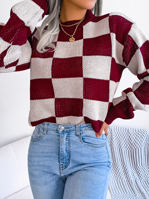 Split-Joint Ribs Contrast Color Abstract Printed Loose Long Sleeves V-Neck Sweater Tops