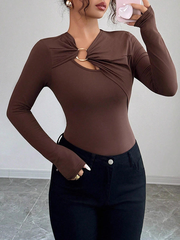 Long Sleeves Skinny Buttoned Solid Color Split-Front V-Neck T-Shirts
