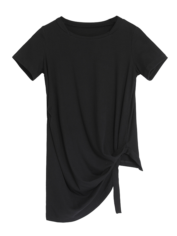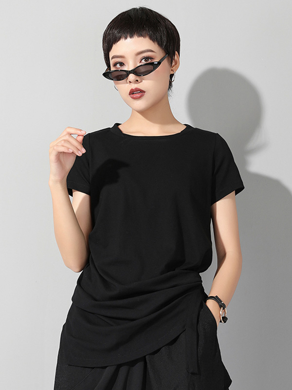 Black Asymmetric Pleats Short Sleeve Round-Neck T-Shirts