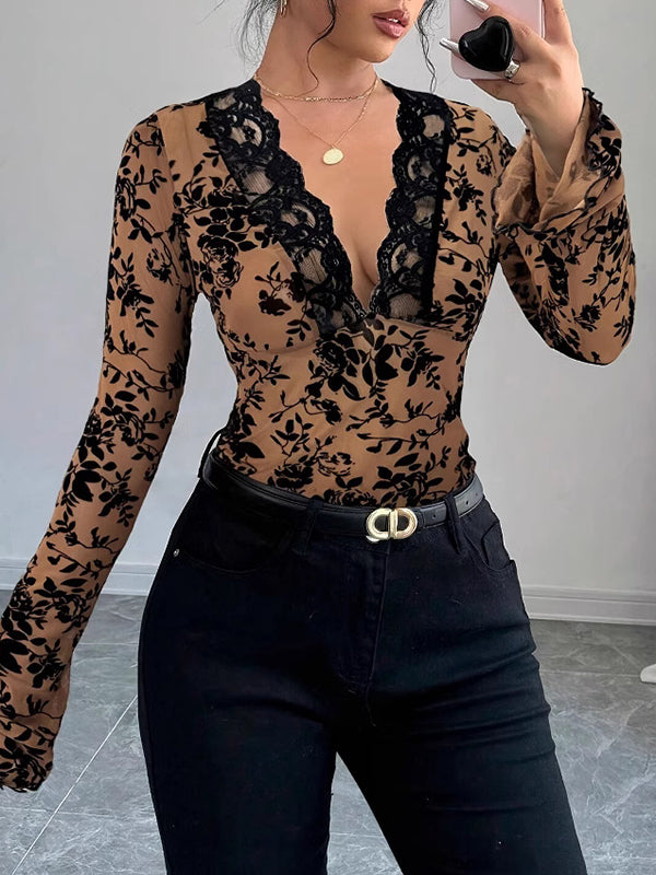 Long Sleeves Skinny Lacy Leopard Split-Joint Deep V-Neck T-Shirts