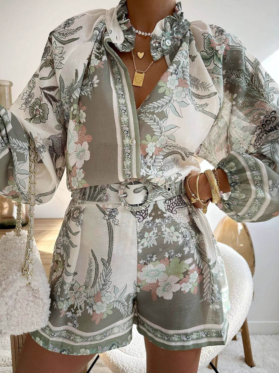 A-Line High Waisted Buttoned Contrast Color Pockets Print Split-Joint Tied Waist Stand Collar Maxi Dresses Shirt Dress