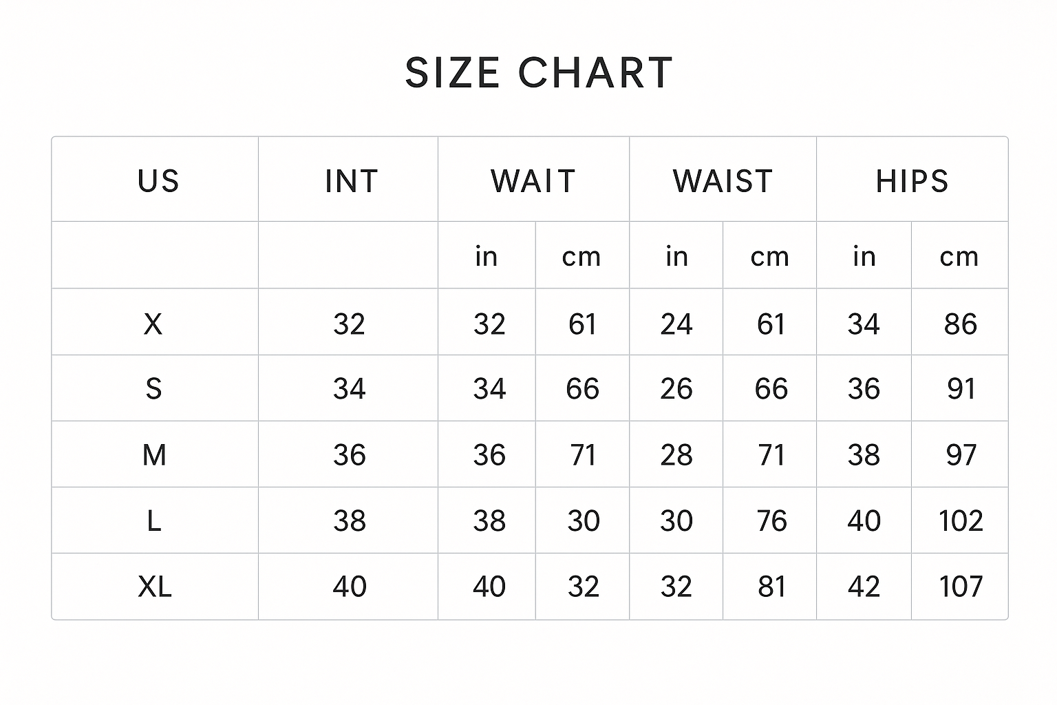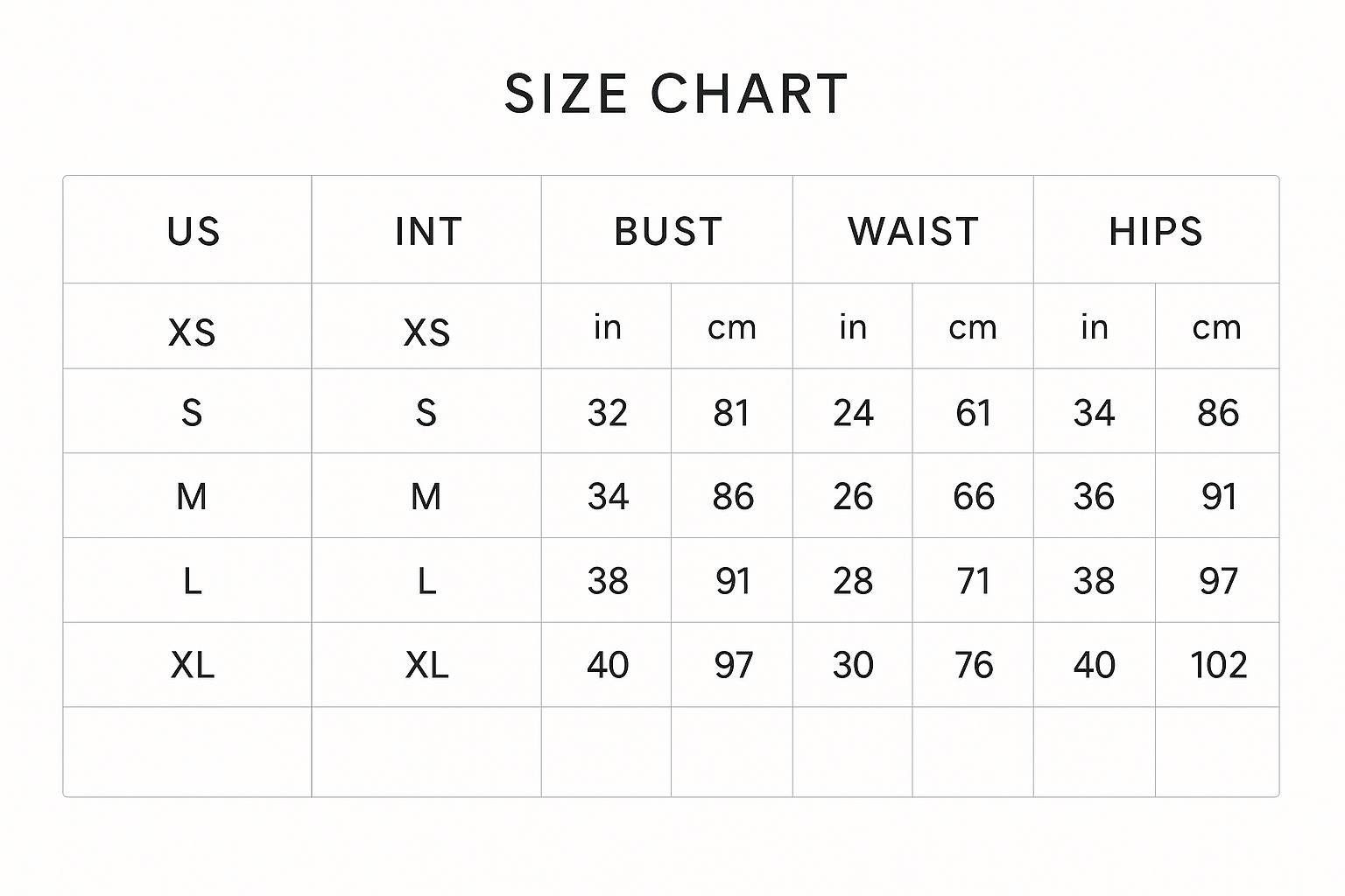 Our core size chart provides a general reference based on US standard sizing for tops and dresses. For the perfect fit, please check the specific size guide available on each product page, as cut and fabric vary by style.