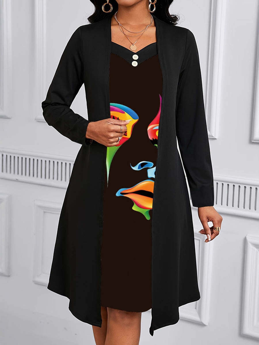 A-Line False Two Buttoned Contrast Color Human Pattern Print Split-Joint Square-Neck Midi Dresses
