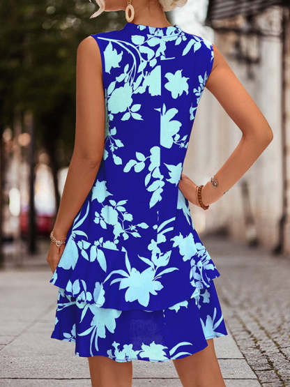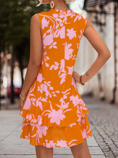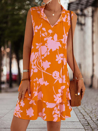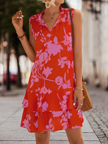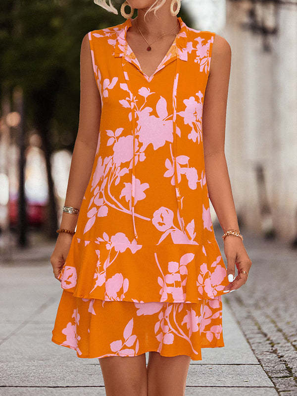 A-Line High Waisted Falbala Printed Split-Joint Tied Tiered V-Neck Mini Dresses