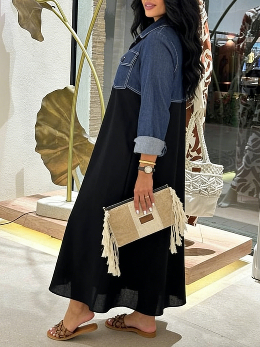 A-Line Long Sleeves Buttoned Pockets Split-Joint Lapel Maxi Dresses