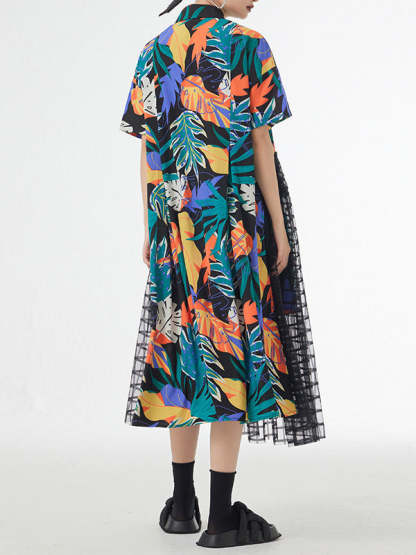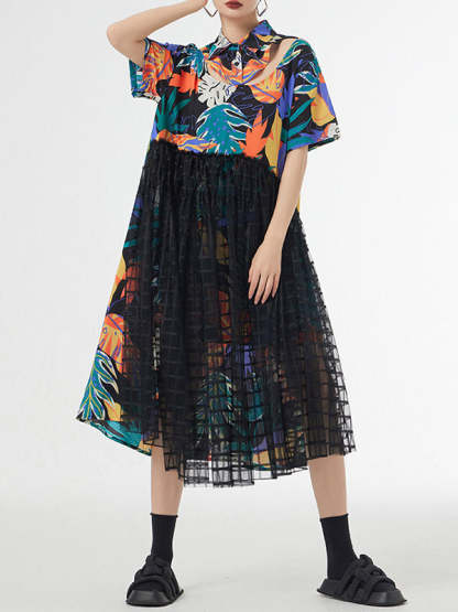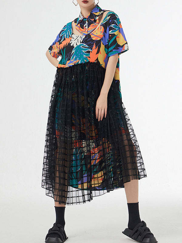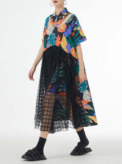 A-Line Loose Buttoned Hollow Mesh Printed Split-Joint Lapel Midi Dresses