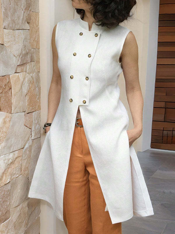 A-Line Loose Buttoned Solid Color Split-Front Split-Side Stand Collar Vest Top