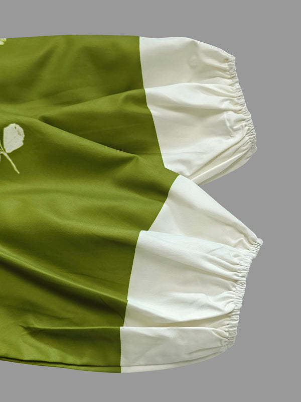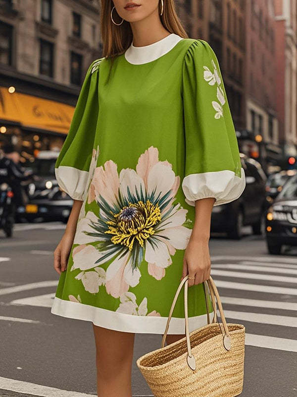 A-Line Loose Flower Print Pleated Round-Neck Mini Dresses