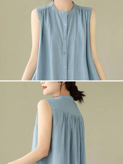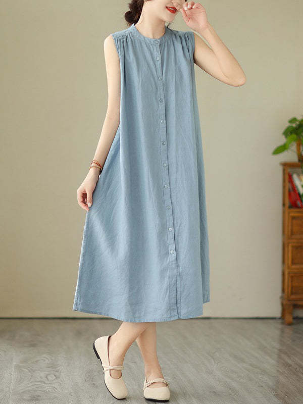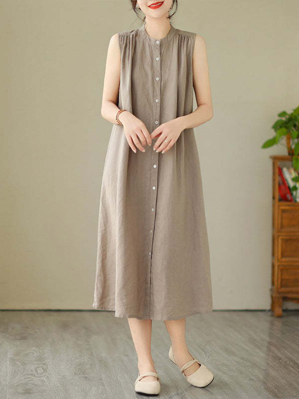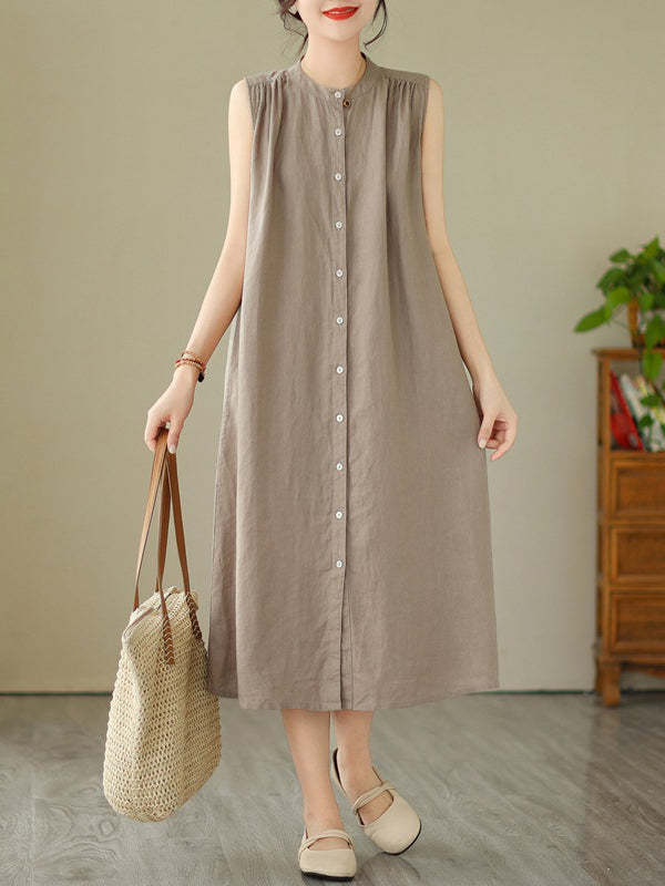 A-Line Sleeveless Buttoned Pleated Solid Color Round-Neck Midi Dresses