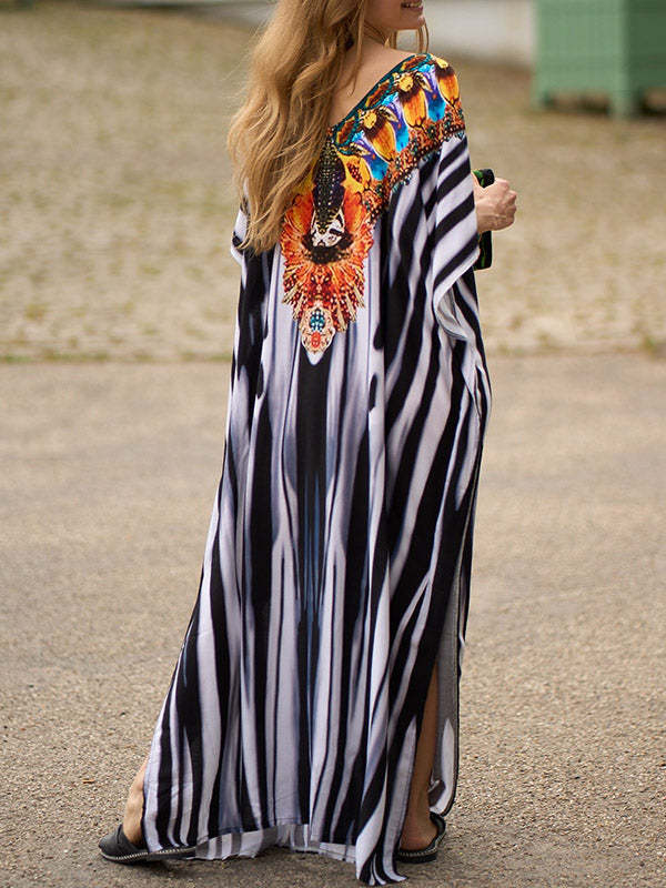 Batwing Sleeves Loose Printed Split-Side Striped V-Neck Beach Cover-Up Maxi Dresses