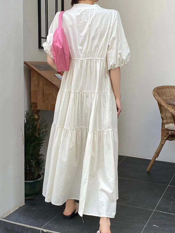 Bishop Sleeve Loose Embroidered Pleated V-Neck Midi Dresses