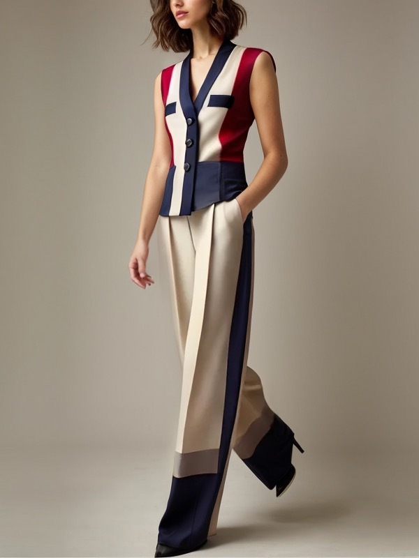 Sleeveless Buttoned Contrast Color V-Neck Vest Top