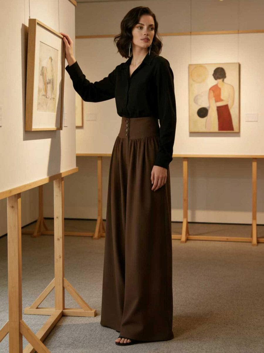 Elasticated Waist High Waisted Buttoned Pleated Pockets Solid Color Split-Joint Pants