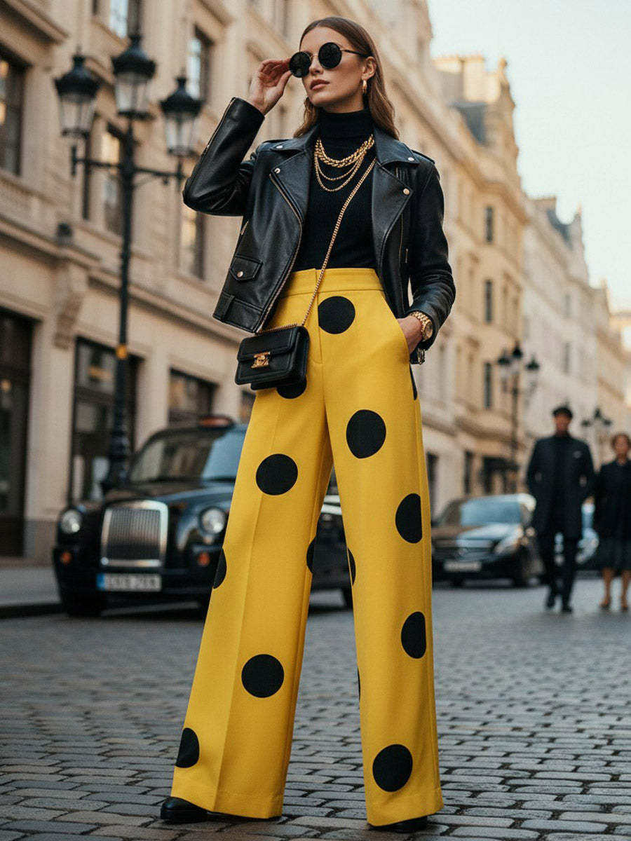 The design inspiration of this pair of trousers is to turn "retro playfulness" into a visual focus - the bright yellow is the color palette of summer sunshine, the large black polka dots are like throwing a retro candy into the brightness, and the wide-leg cut blends the flamboyance into a relaxed aura. It's like bringing the bright and lively vibe of a fashion show into daily life. Once you put it on, just pair it with a plain top and you'll be a "vibrant glow" on the street. Even when you walk, you'll carry your own eye-catching background music.