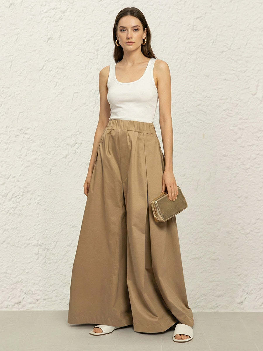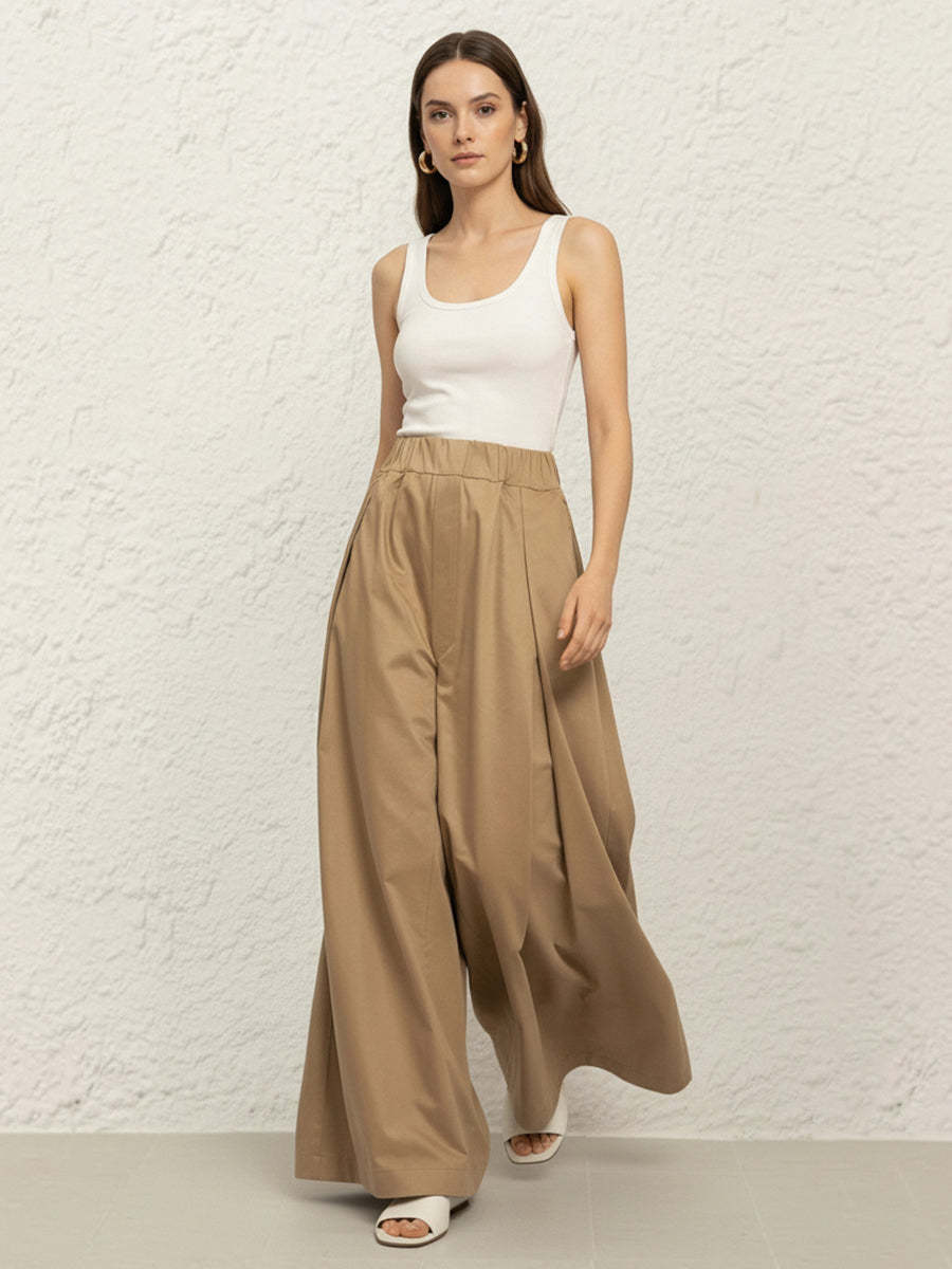Elasticated Waist High Waisted Pleated Pockets Solid Color Pants