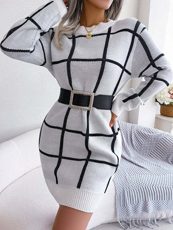 Elasticated Waist Long Sleeves Belted Contrast Color Plaid Round-Neck Mini Dresses Sweater Dresses