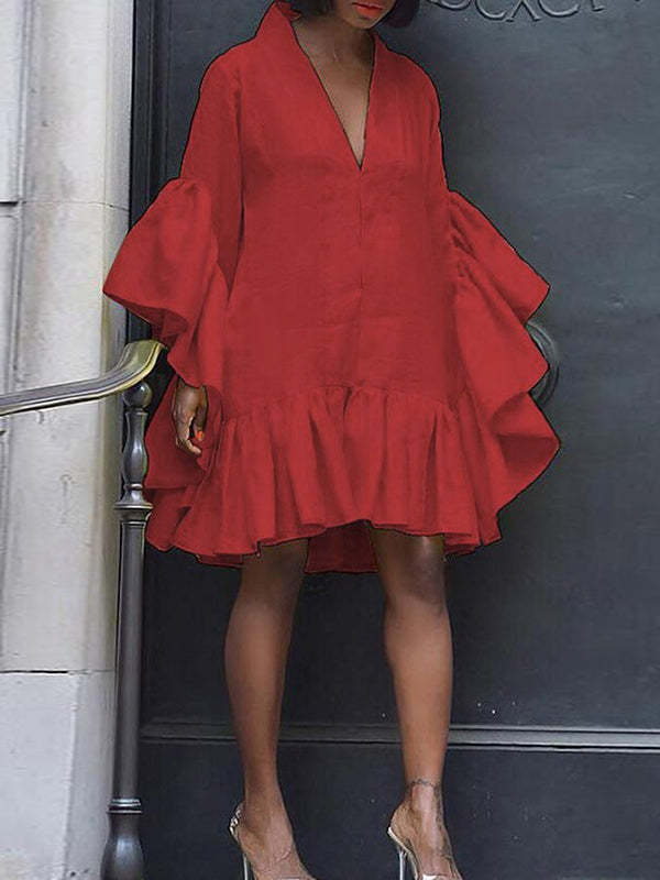 Flared Sleeves Loose Pleated Solid Color Split-Joint V-Neck Mini Dresses