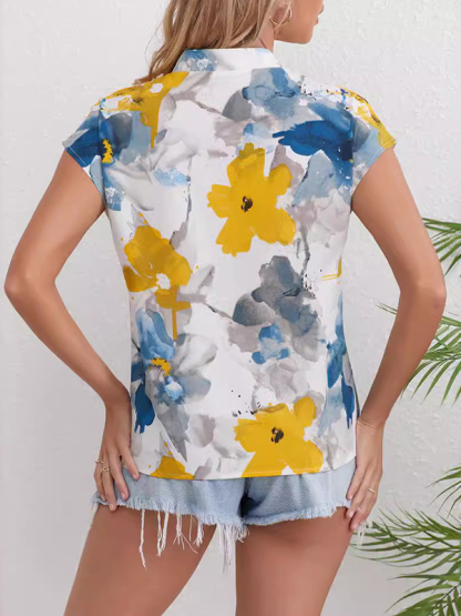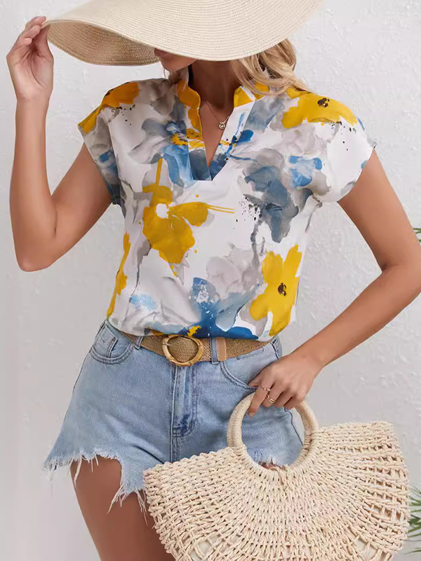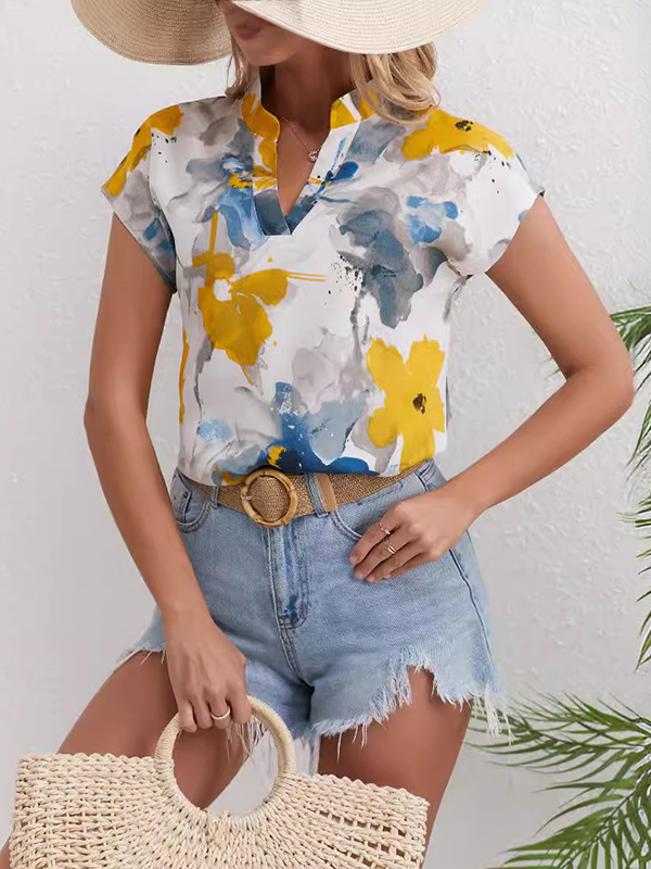 Flower Print Contrast Color Comfort Short Sleeves Loose V-Neck Blouses&Shirts Tops