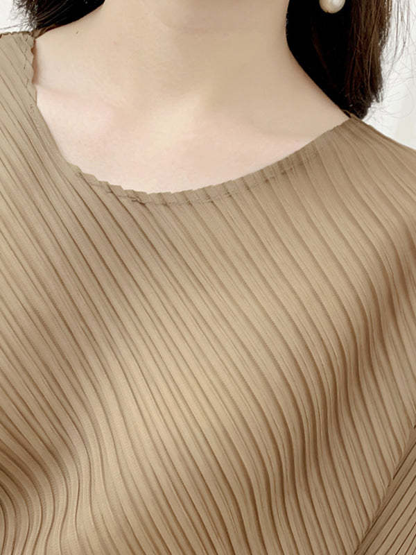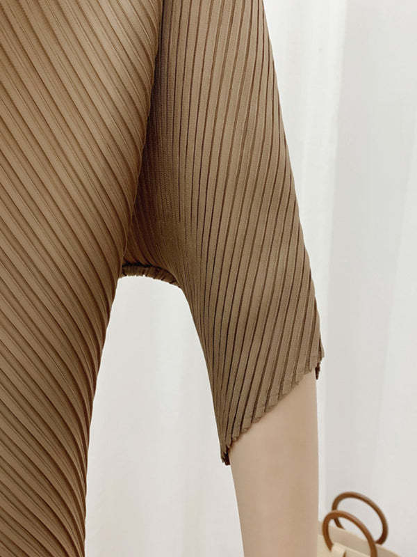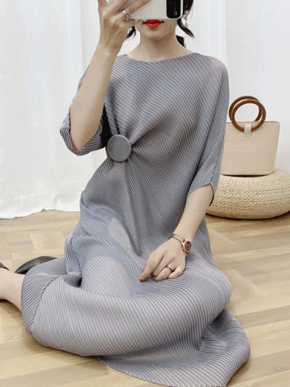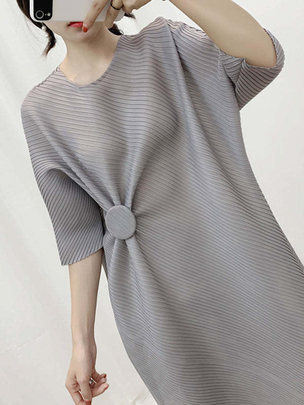 Half Sleeves Irregular Clipping Pleated Solid Color Round-Neck Midi Dresses