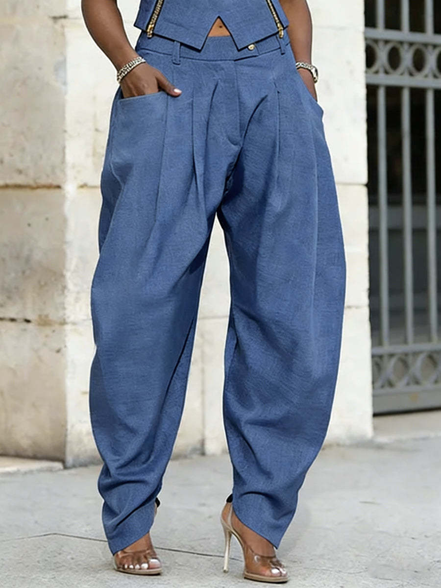 High Waisted Loose Buttoned Pleated Pockets Solid Color Jean Pants Bottoms
