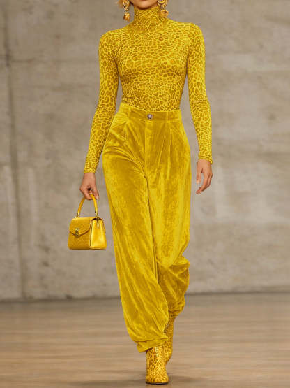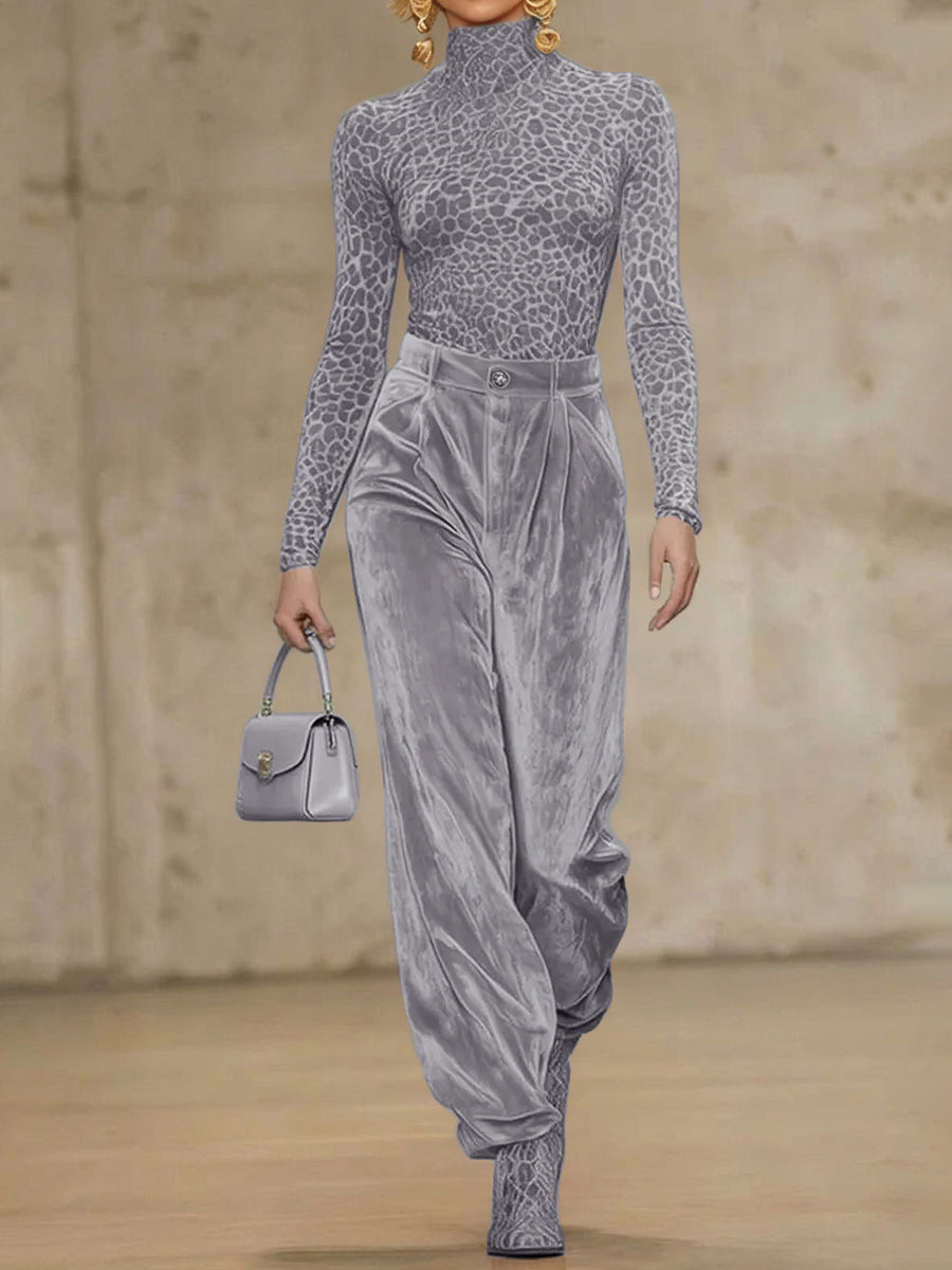 High Waisted Pleated Pockets Solid Color Velvet Pants Trousers
