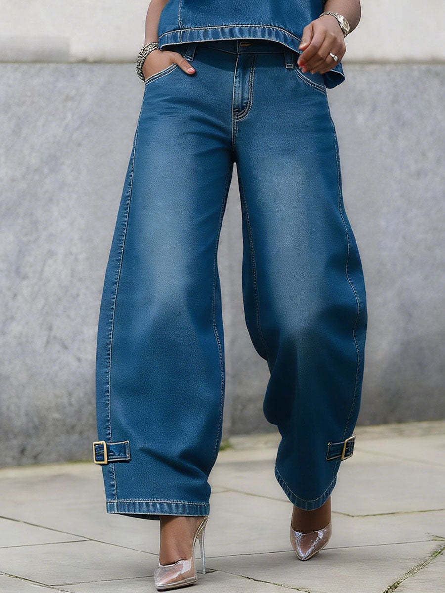 High Waisted Wide Leg Buckle Pockets Solid Color Jean Pants Bottoms