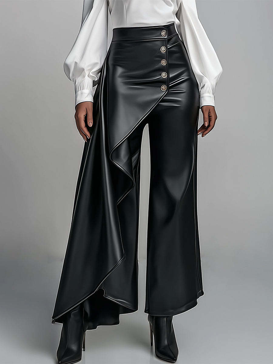 High Waisted Wide Leg Buttoned Pleated Solid Color Split-Joint Zipper Pants Trousers