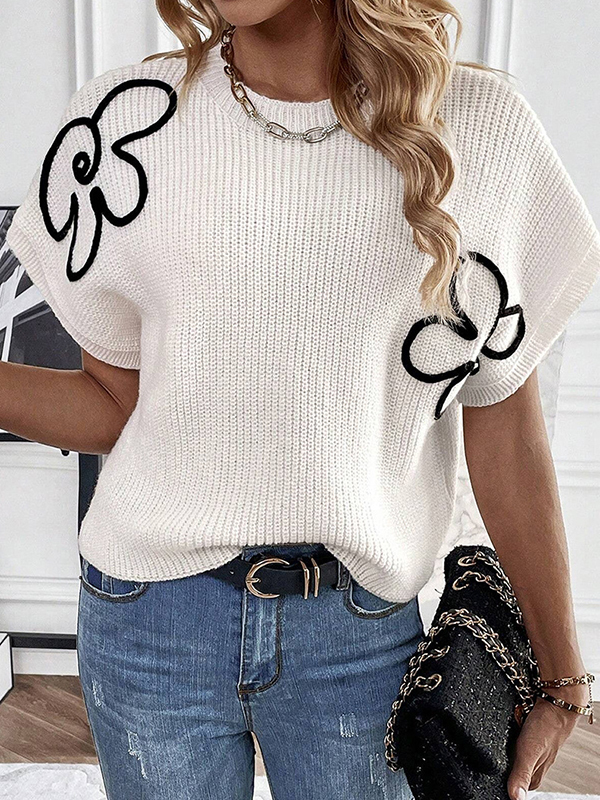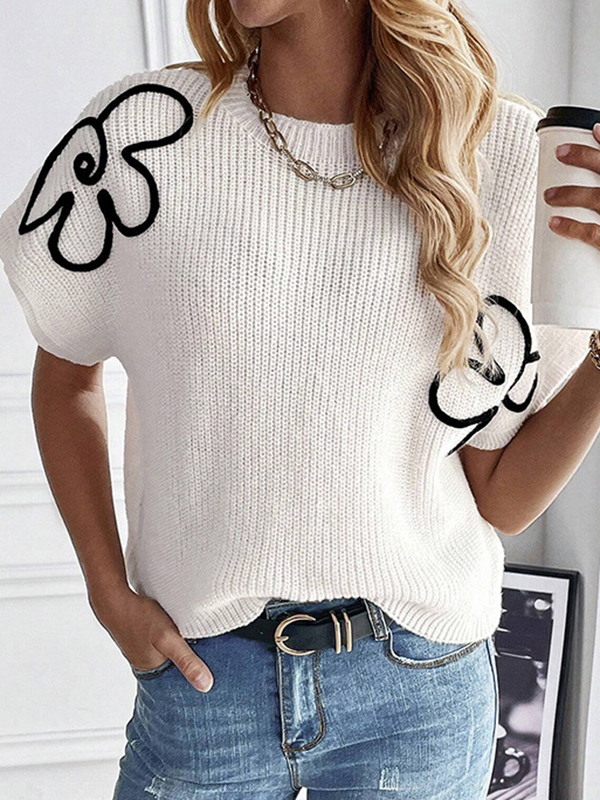 Knitted Flower Short Sleeves Loose Round-Neck Sweater Tops Pullovers