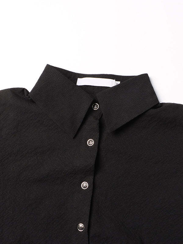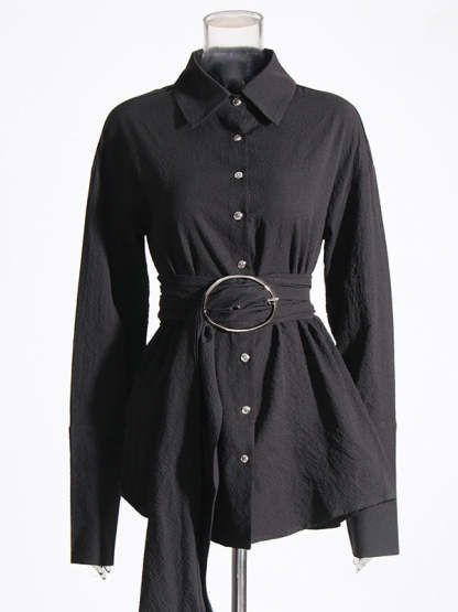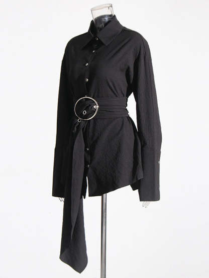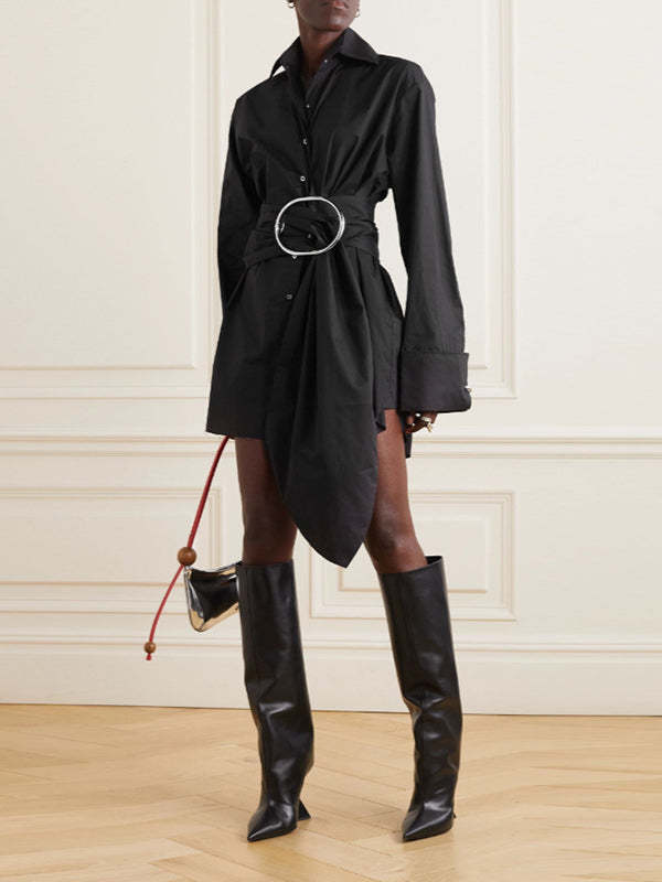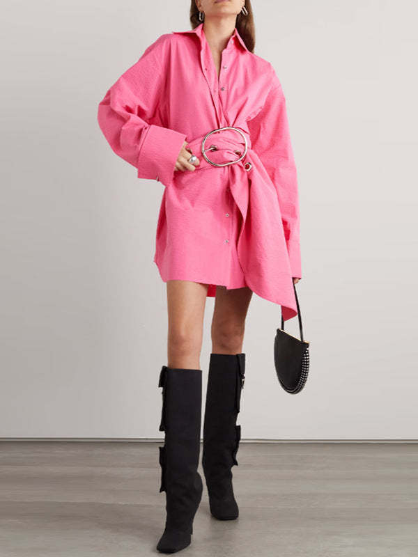 Long Sleeves Loose Belted Buttoned Lapel Mini Dresses Shirt Dress