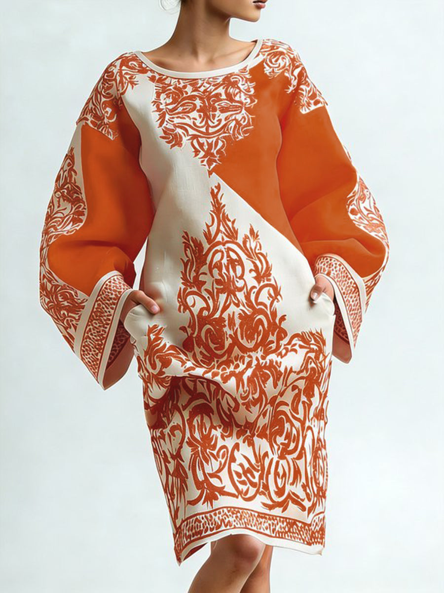Long Sleeves Loose Contrast Color Flower Print Pockets Round-Neck Mini Dresses