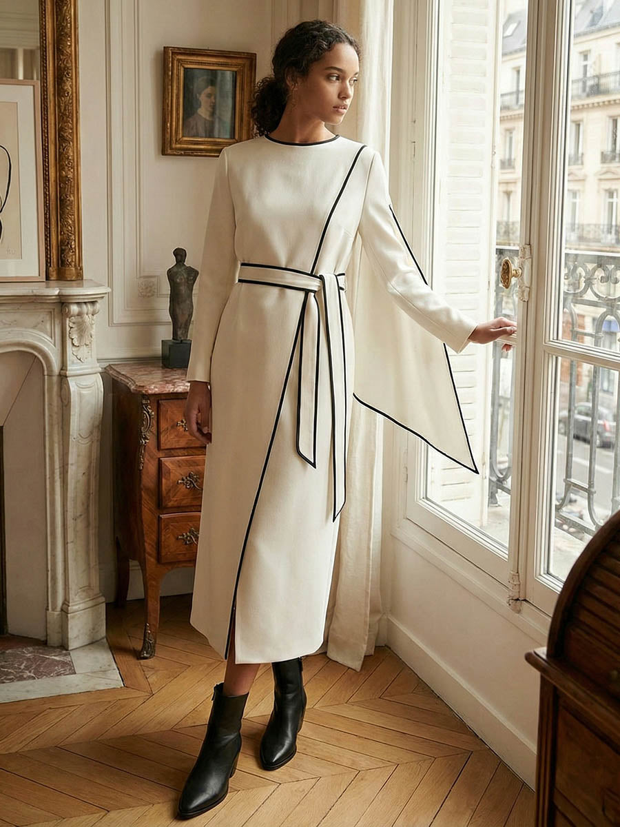 Long Sleeves Minimalist Belted Comfort Contrast Color Round-Neck Midi Dresses