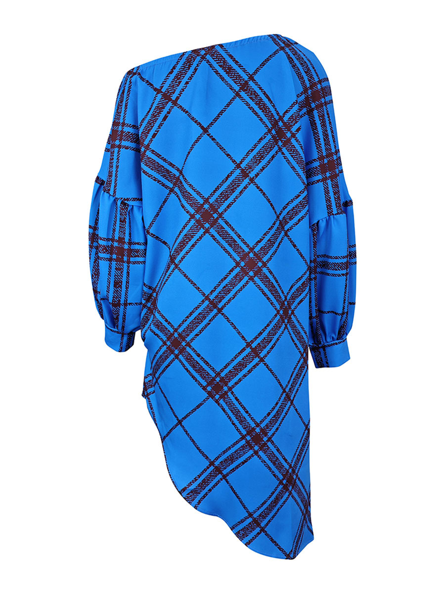 Long Sleeves Puff Sleeves Asymmetric Contrast Color Plaid Pleated One-Shoulder Mini Dresses