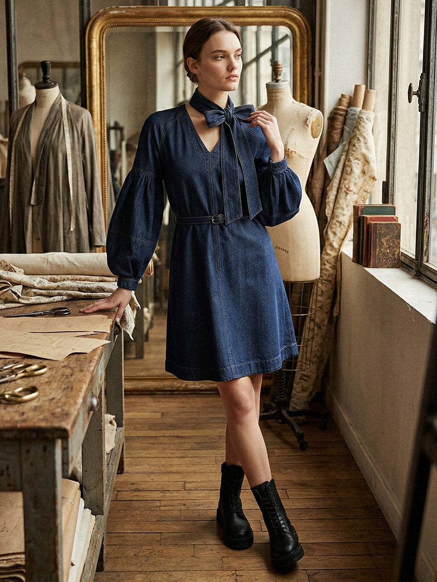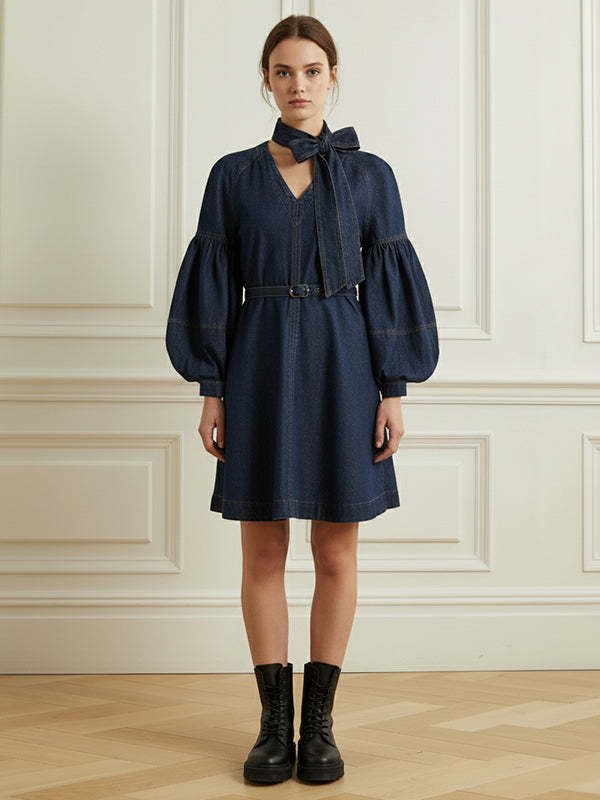 Long Sleeves Puff Sleeves Belted Bow-Embellished Solid Color V-Neck Mini Dresses