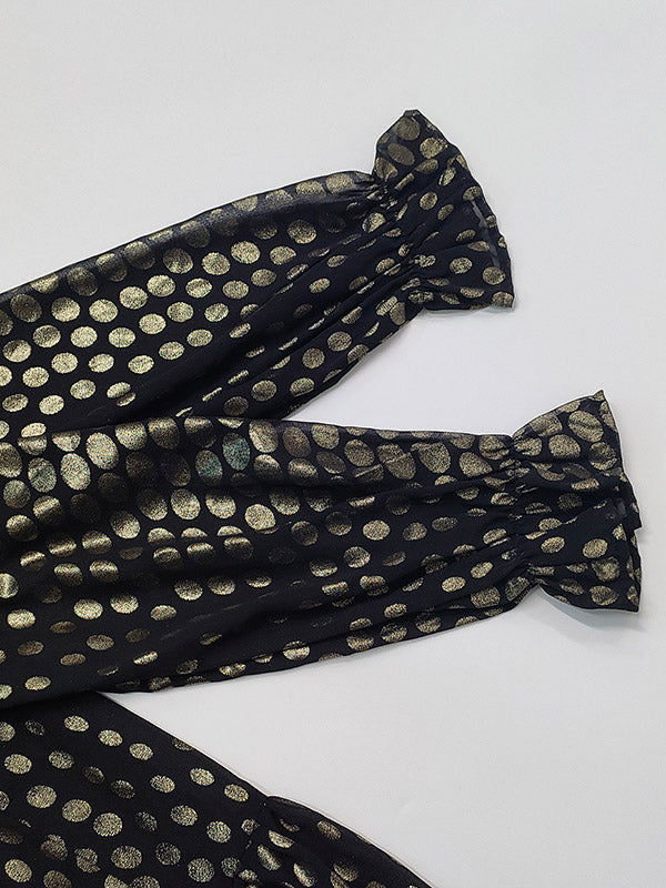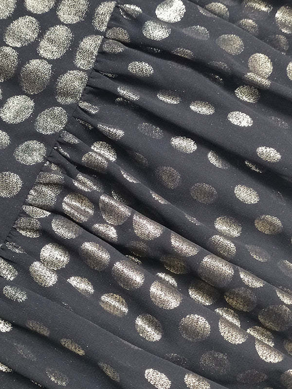 With one gilded round piece after another, the flowing starlight is pieced together. The high-neck bow is the footnote of French laziness, and the lantern sleeves are wrapped in light chiffon - when the black and gold polka dots gently sway with each step, it's as if the lights of the ball in old movies have been incorporated into the pleats of the everyday skirt.