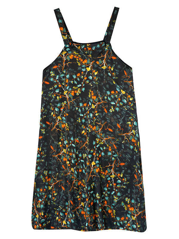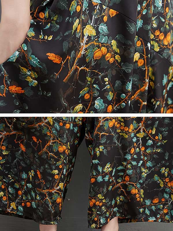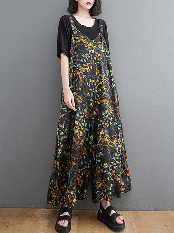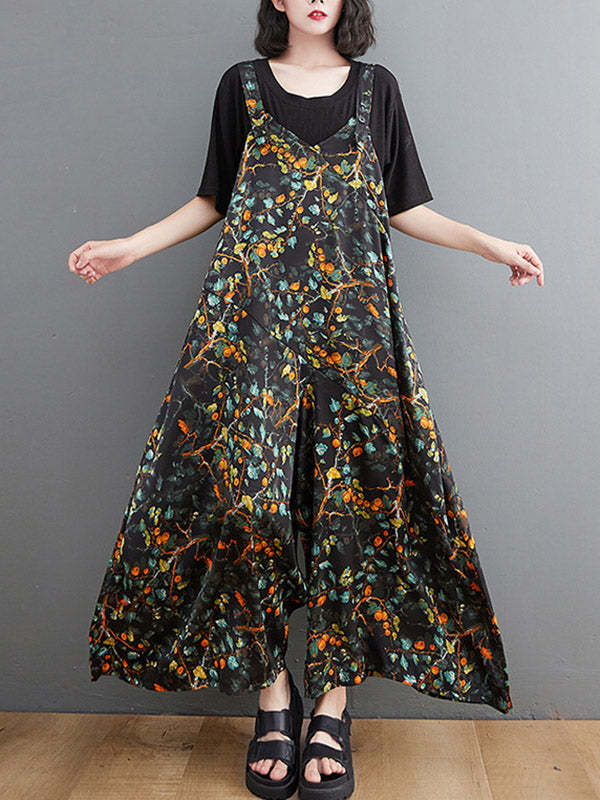 Loose Artistic Retro Ramie Cotton Floral Printed V-Neck Overalls