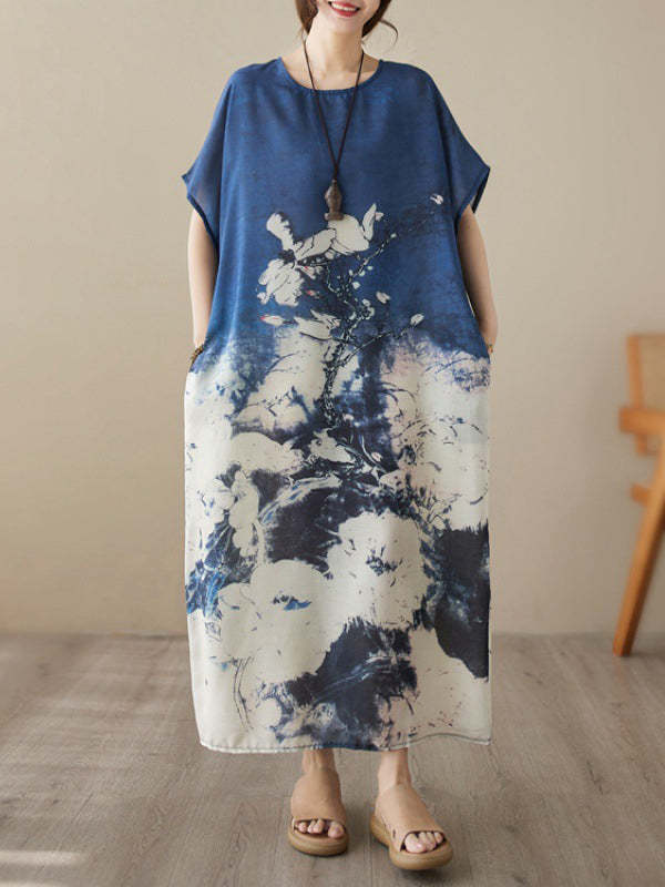 Loose Short Sleeves Printed Round-Neck Maxi Dresses