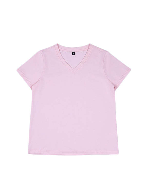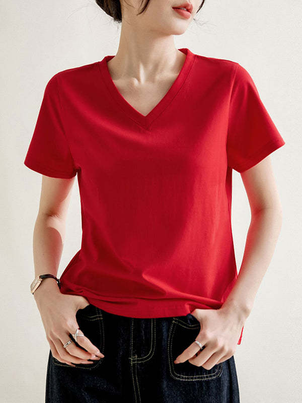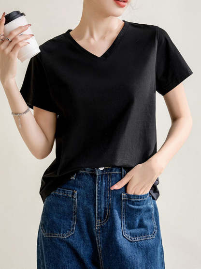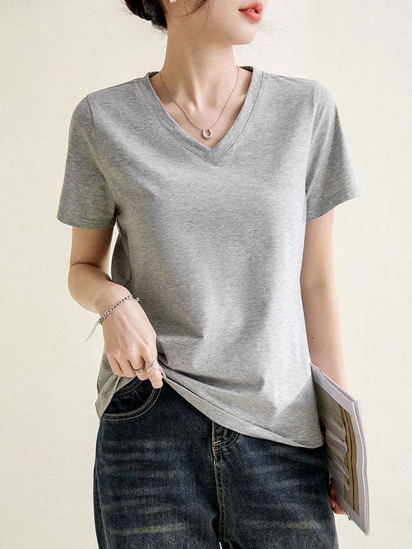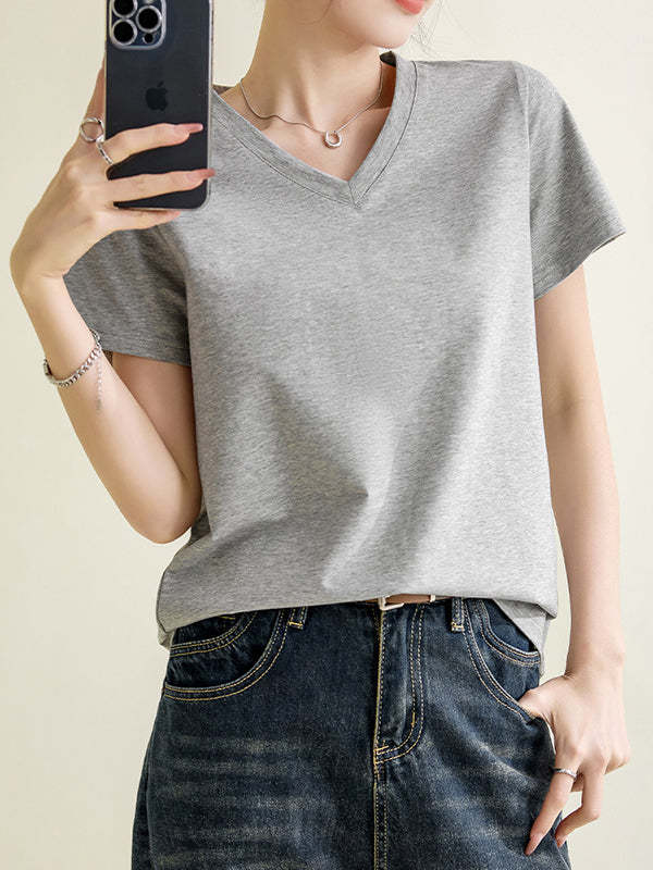 Loose Short Sleeves Solid Color V-Neck T-Shirts Tops