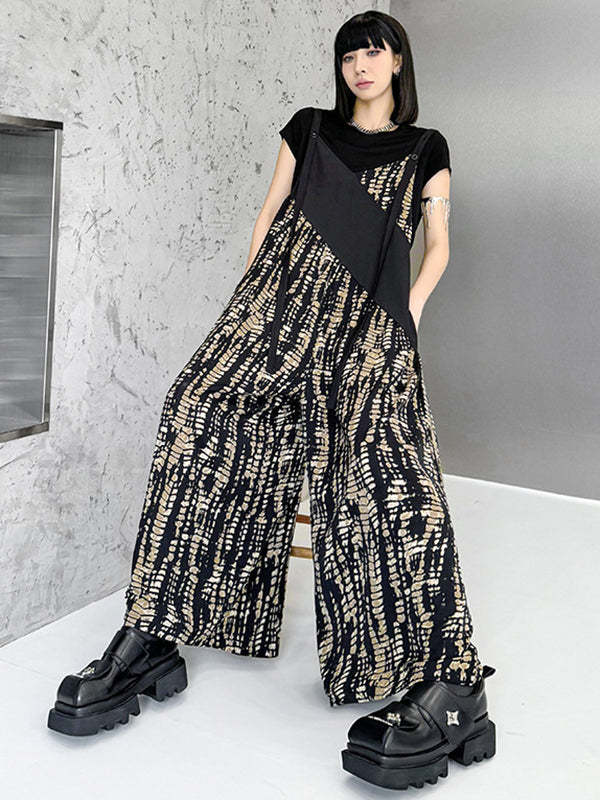 Loose Sleeveless Asymmetric Contrast Color Printed Split-Joint Spaghetti-Neck Overalls