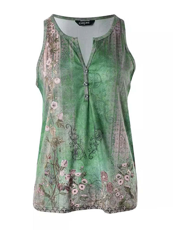 Loose Sleeveless Buttoned Flower Print V-Neck Vest Top