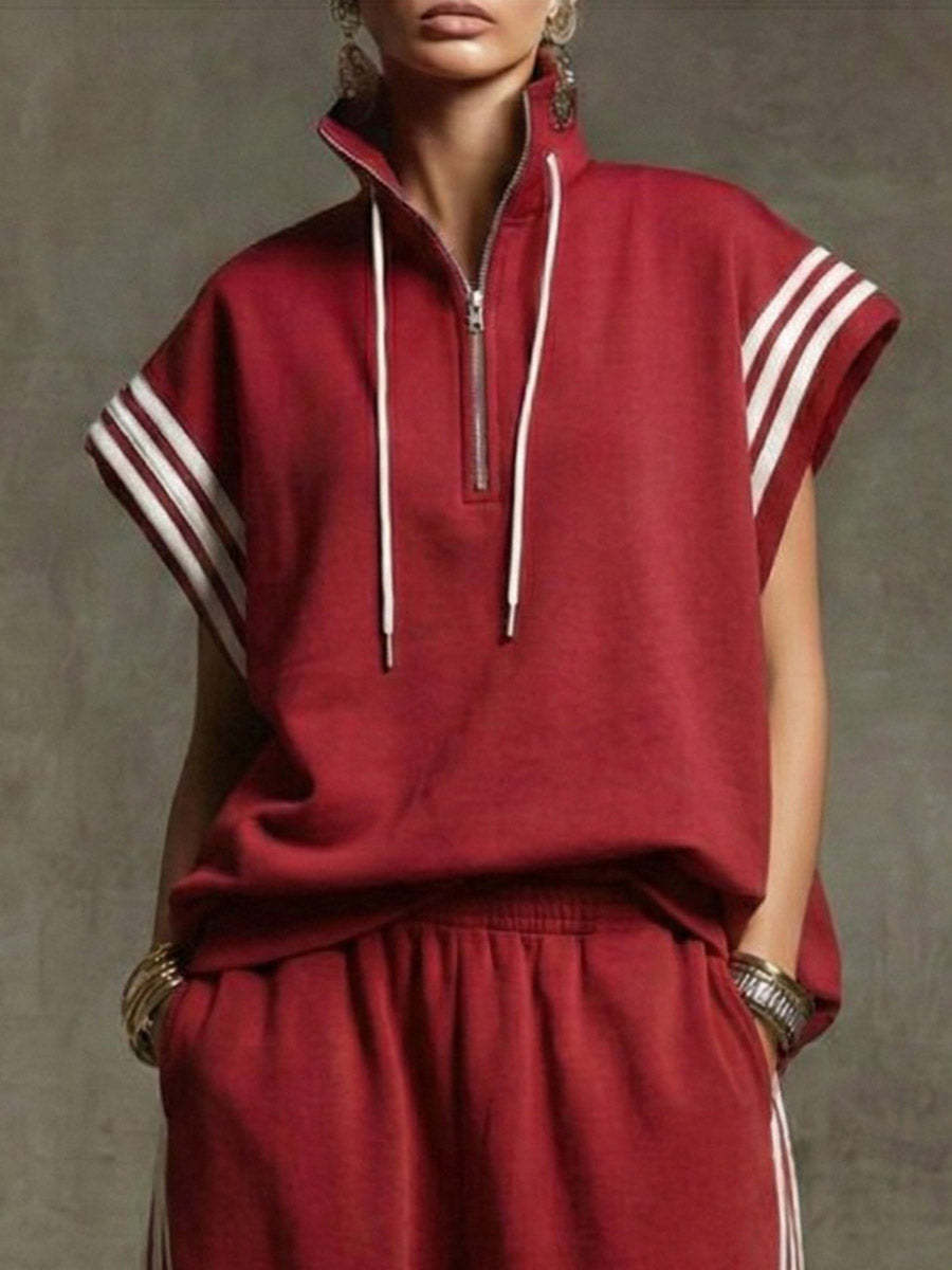 Loose Sleeveless Contrast Color Drawstring Split-Joint Striped Zipper Mock Neck Blouses&Shirts Tops