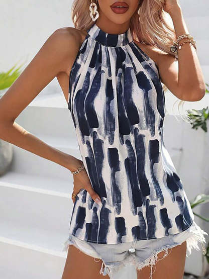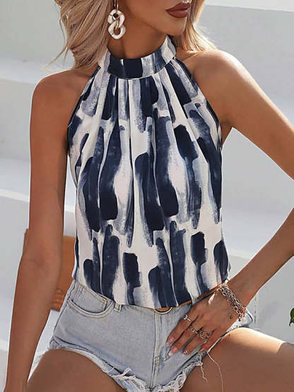Loose Sleeveless Contrast Color Hollow Pleated Halter-Neck Vest Top