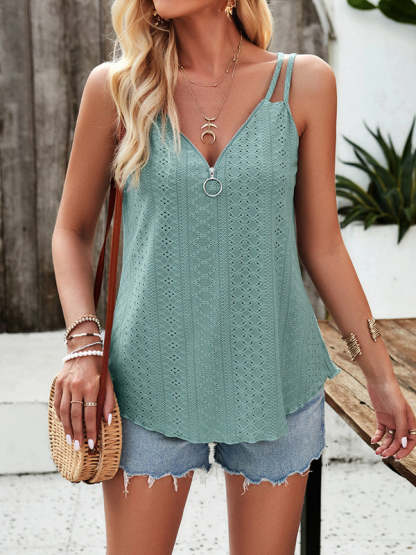 Loose Sleeveless Jacquard Solid Color Zipper Spaghetti-Neck Vest Top